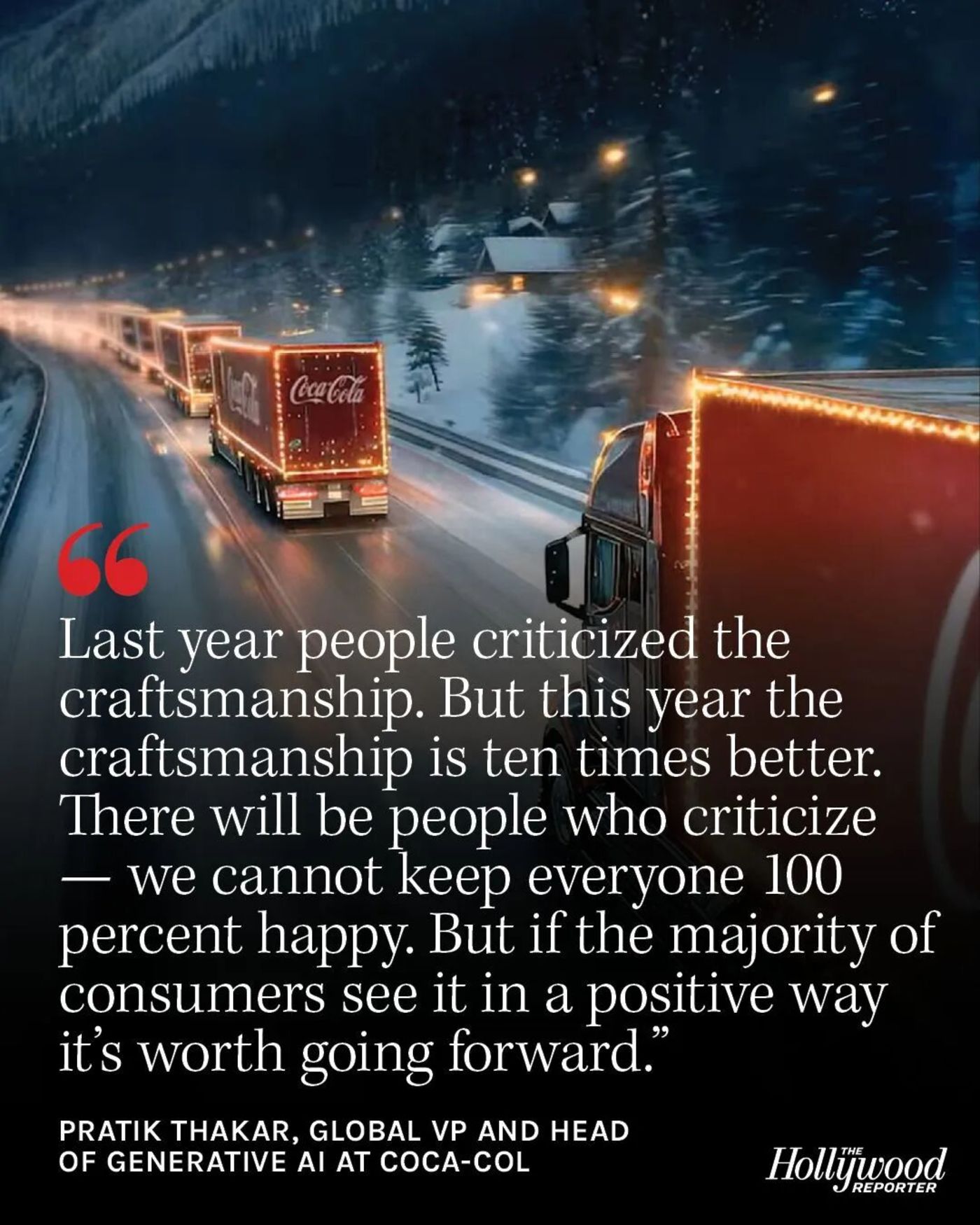 另一方面,业界质疑 AI 广告 「降低成本」 的效果。因为根据 《华尔街日报》 报道,本次假日营销活动共有约 100 人参与,涵盖可口可乐公司、其广告代理公司 WPP 以及人工智能创意工作室 Silverside 和 Secret Level。这个人数与以往不使用人工智能的广告制作规模相当。