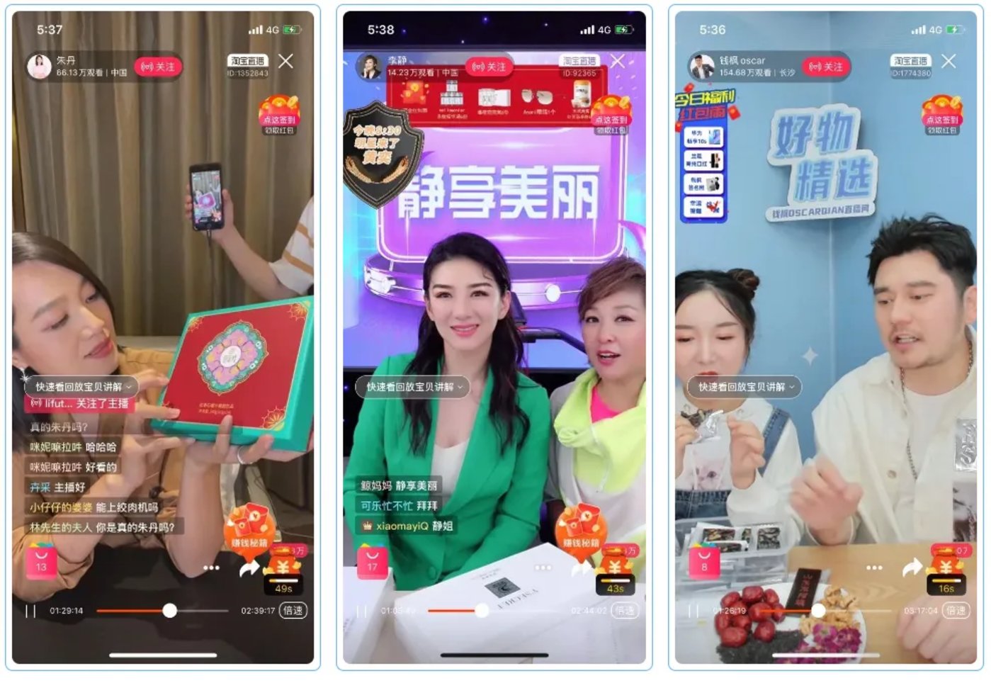 朱泳腾卖着 69.9 元的诗馨语鱼子酱美肤气垫霜,迟帅卖着 399 元的可复美胶原棒套装,高梓淇则卖起 79 元的草本初色女性内裤……
