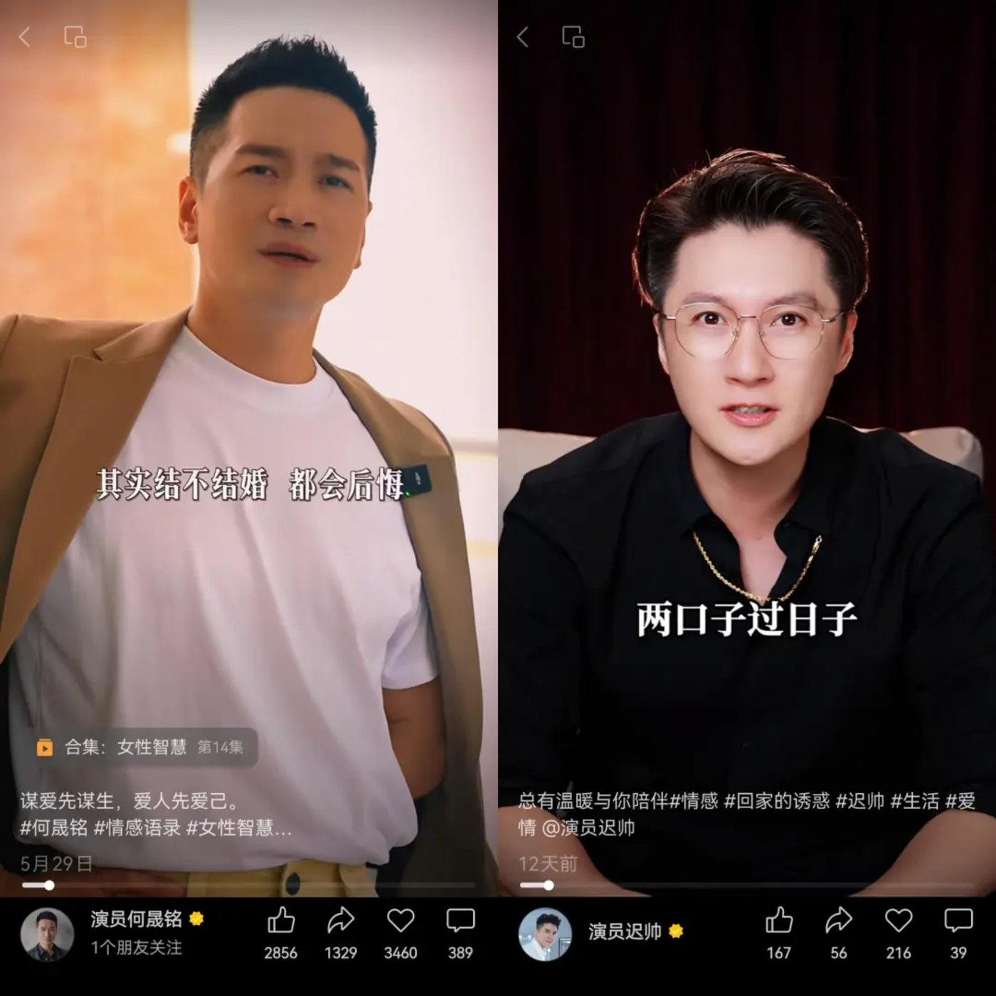 类似的情景,还出现在何晟铭、高梓淇、任重等男明星的账号中,他们或穿着西装、新中式男装,或穿着衬衫和卫衣,讨论着各种女性关注的话题,念着经典语录,还会给视频配上文案,「姐姐你是这样睡的吗?」「愿对的人与你常伴左右」「长相年轻的女人,她们往往善良、温和而自律。」