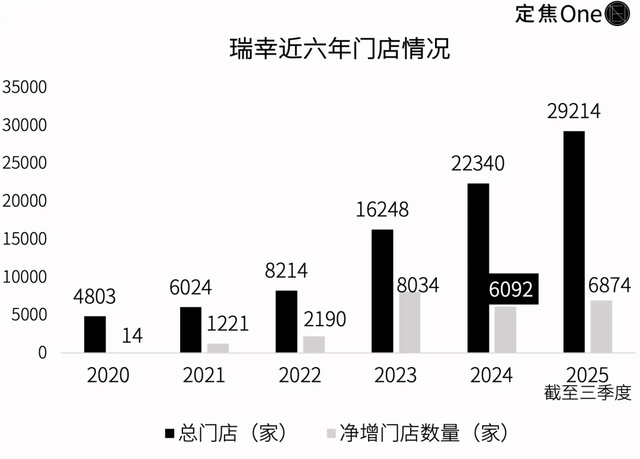 而后财务数据也出现波动,在 2025 年三季度财报中,瑞幸营收同比增长 50.2%,净利却同比下降 2%,陷入增收不增利局面。这背后是成本与扩张的双重压力:一方面,外卖大战带动第三方订单激增,直接推高配送费用同比暴涨 211.4% 至 28.9 亿元,进而拉动总运营费用同比增长 57% 至 135.1 亿元;另一方面,虽然瑞幸仍保持可观的扩店势头,但相较于 2023 年的高速扩张,门店增速已明显放缓。