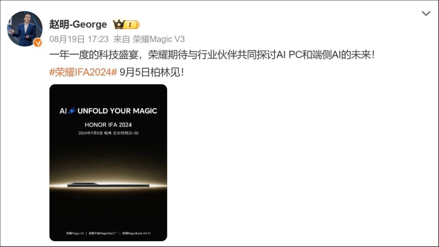 AI PC 也是近两年围绕新技术展开品类创新的代表,荣耀此前已经官宣了多款产品将会在即将开幕的 IFA 2024 上进行展示,包含荣耀 Magic V3 折叠屏手机、荣耀 MagicPad2 平板以及荣耀 MagicBook Art 14 笔记本。