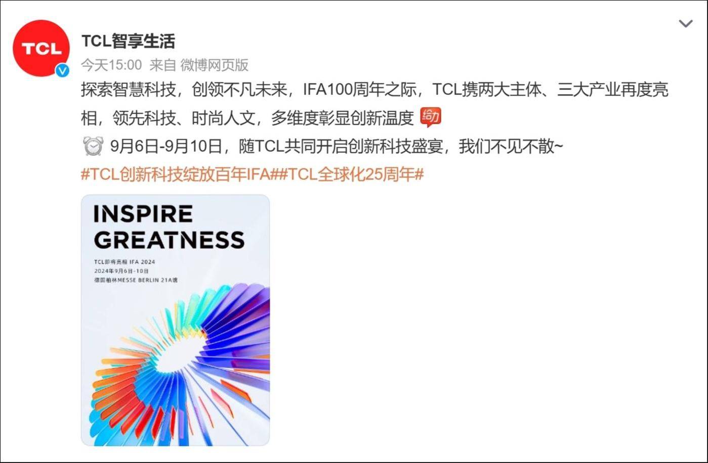 此次 IFA,TCL 通过 TCL 实业和 TCL 科技两大主体,携智能终端、半导体显示、新能源光伏三大产业参展,展位总面积为 2662 平米。TCL 实业将展出空调、冰洗、AR 眼镜、手机、平板、商显、音箱、车载等全品类智能终端产品和智慧能源解决方案。