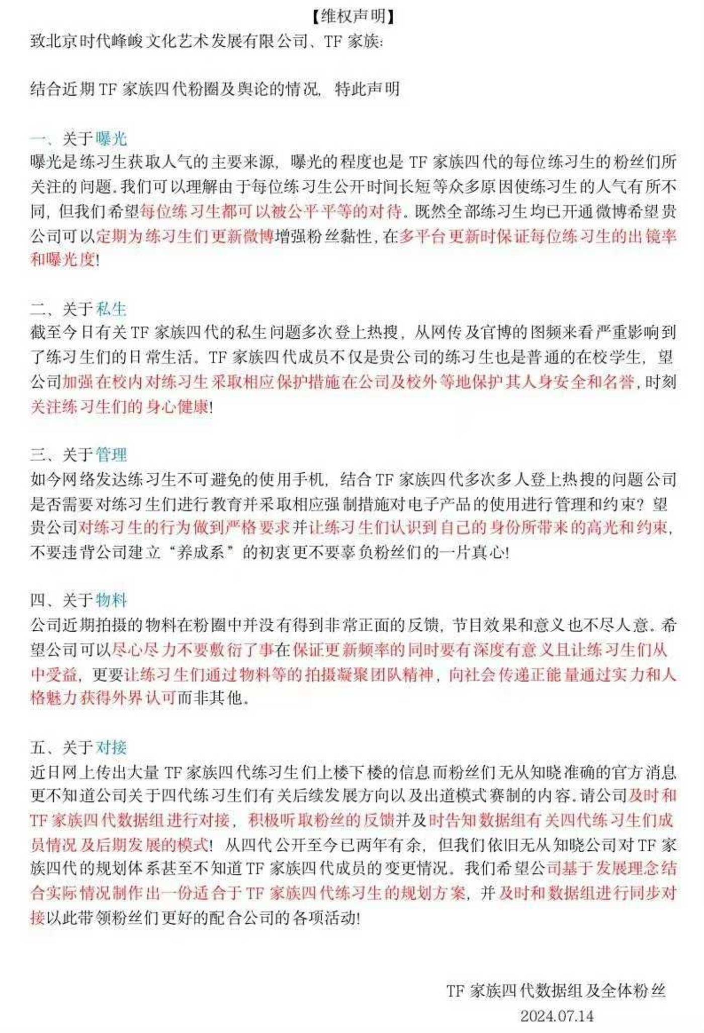 比如在 8 月 10 日,TF 家族三代数据组便发布联合维权声明,要求时代峰峻必须再演唱会现场宣布出道人选、番位,并指出粉丝愿意承担跨国的舟车劳顿与添加剂票,「都是因为贵司承诺马来西亚演唱会即为出道演唱会」,更强硬要求 「拒绝模棱两可」。