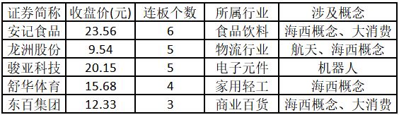 从连板情况来看,今日首板个股有 36 只;2 连板的个股有 10 只;3 连板及以上的个股有 7 只。今日连板数排名前 5 的个股包括安记食品、龙洲股份、骏亚科技、舒华体育、东百集团,具体如下表所示。