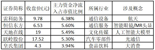 主力资金净流入金额占市值比例排名前 5 的个股分别为雷科防务、恒信东方、天地在线、跃岭股份、皇氏集团。