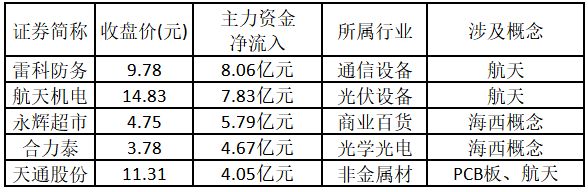 值得注意的是,今日主力资金净流入金额前两名的个股均属于航天板块,分别为雷科防务和航天机电。