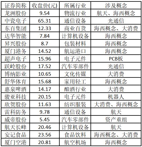 涨停板个股中,股价创出近一年新高的个股有 18 只 (不包括创出历史新高的个股),包括龙洲股份、中瓷电子、东百集团、达华智能、昇兴股份、厦门港务、超声电子、跃岭股份、博纳影业、舒华体育、惠泉啤酒、骏亚科技、欣贺股份、雷科防务、威帝股份、航天长峰、安记食品、厦门空港,具体如下表所示。