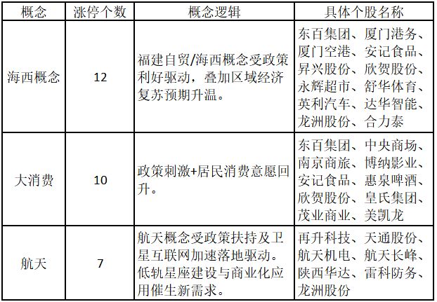 从概念特征来看,今日涨停板个股中,海西概念、大消费和航天概念的个股最多。