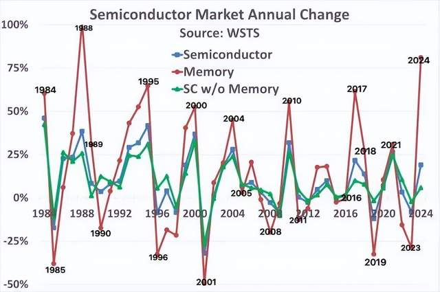 图中针对半导体总量、存储器市场以及剔除存储器后的半导体市场进行了比较分析。可以清晰地看到,存储器市场呈现出极为剧烈的波动,曾有高达 102% 的增长幅度以及 49% 的下滑幅度等极端情况出现,而与之形成鲜明对比的是,不包含存储器的市场则表现得较为平稳,其波动区间处于增长 42% 至下滑 26% 之间。