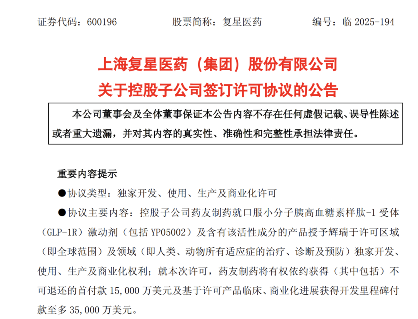 而且这波 BD 交易的信号意义远大于金额本身,说明复星医药的小分子平台,开始进入全球主流药企清单。
