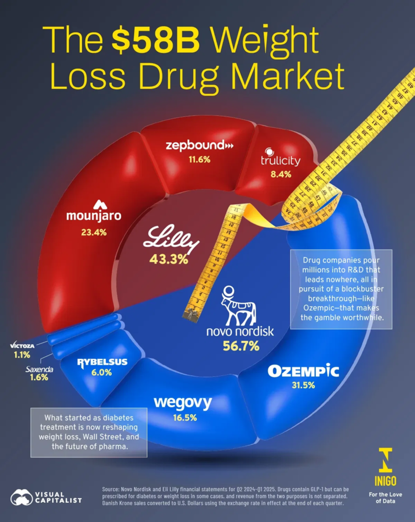这几年 GLP-1 的热度一直很高,从减重到糖尿病到心血管风险管理,把礼来和诺和诺德市值打上了 7000 亿美金的高度。根据高盛和摩根士丹利的测算,2030 年全球 GLP-1 减重药市场可能冲击 600–900 亿美金,甚至有机构给到 1000 亿以上的终局空间。