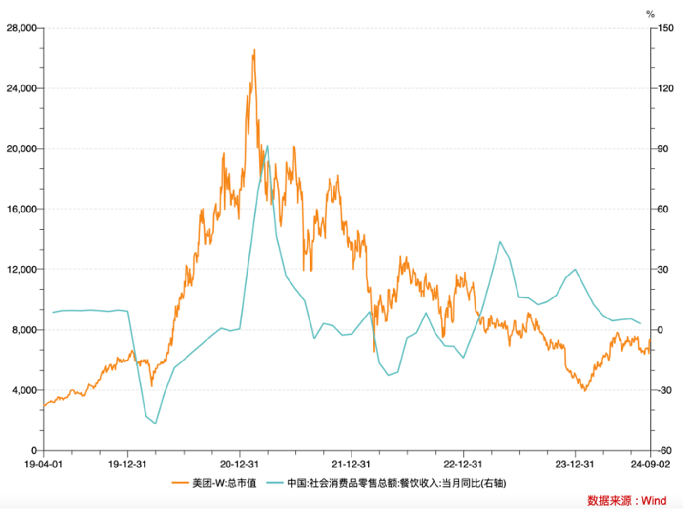 尽管美团通过业务创新提高了短期经营效率,强化了市场信心,但当我们把美团市值与全国餐饮收入大盘做对比时,会发现两条折线走势呈高度相关性,且美团表现大致领先行业大盘 2 个月左右。