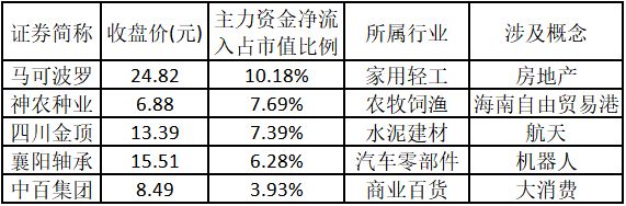 主力资金净流入金额占市值比例排名前 5 的个股分别为马可波罗、神农种业、四川金顶、襄阳轴承、中百集团。