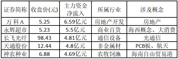 从主力资金来看,今日涨停板个股中,主力资金净流入金额排名前 5 的个股分别为万科A、永辉超市、长飞光纤、天通股份、神农种业。