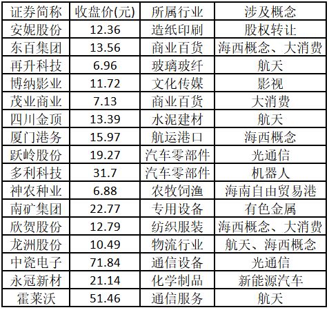 涨停板个股中,股价创出近一年新高的个股有 16 只 (不包括创出历史新高的个股),包括安妮股份、东百集团、再升科技、博纳影业、茂业商业、四川金顶、厦门港务、跃岭股份、多利科技、神农种业、南矿集团、欣贺股份、龙洲股份、中瓷电子、永冠新材、霍莱沃,具体如下表所示。