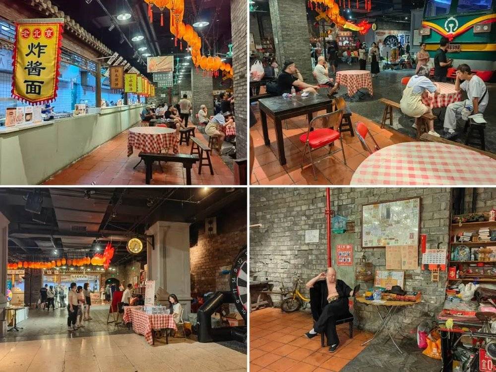 花 30 元购票后,内参君顺着电梯 「穿越回 80 年代」,这里主打怀旧复古风,老北京的胡同、门市映入眼帘。在餐饮区,主要售卖老北京小吃,然而稀稀拉拉的客人并未坐满,且基本没有就餐的。在其它区域,游客也并不多,在整个复古空间的衬托之下,不免显得有些冷清。一位 「扮演」 胡同大爷的工作人员,索性葛优躺下,慵懒地刷着手机。