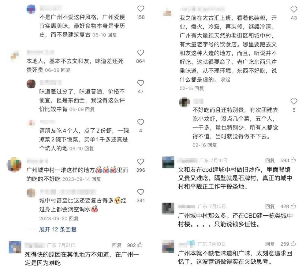 尽管如此,也没有打消网友们的质疑。广州文和友开业初期,每天门庭若市,甚至需要排队 3 小时以上。但随后出现了明显的水土不服,人气急转直下,排队等候的人数大幅减少。此后,广州文和友不断调整方向,入驻的商户变更不断,但都没有挽留住客群。