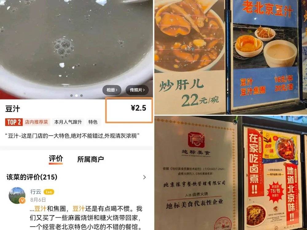 左:某老北京特色饭馆豆汁价格,右:和平菓局菜单及地标证书,豆汁 16 一碗,摄图:内参君