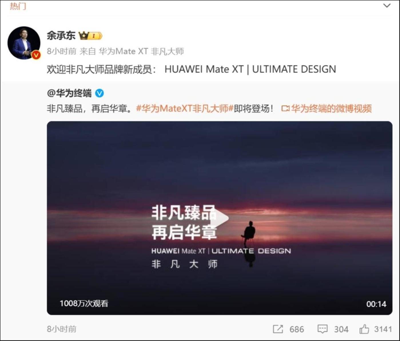 9 月 2 日,华为官宣将于本月 10 日 14:30 举办新品发布会,今天上午,华为终端发布预热视频,告知新品将会命名为华为 Mate XT 非凡大师,随后,华为常务董事、终端 BG 董事长、智能汽车解决方案 BU 董事长余承东转发该微博,值得注意的是,其用于显示手机机型的微博小尾巴已经更新为 「华为 Mate XT」。