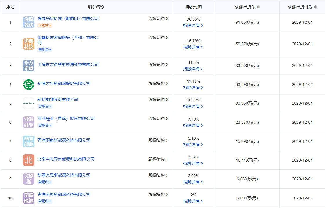 前两大股东分别为通威股份 (通过子公司持股 30.35%) 和协鑫集团 (通过子公司持股 16.79%),其余股东包括新特能源、大全能源、东方希望等硅料企业,每家持股比例根据其市场份额和产能规模进行分配。