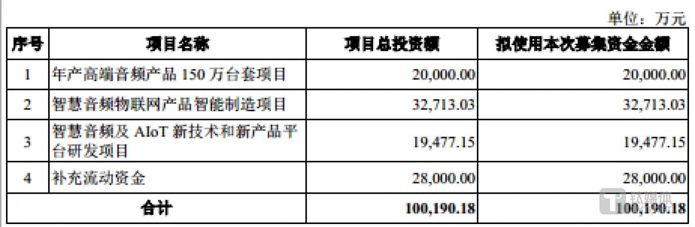 从募投项目上看,汉桑科技此次欲募集 10.02 亿元分别用于年产高端音频产品 150 万台套项目、智慧音频物联网产品智能制造项目、智慧音频及 AIoT 新技术和新产品平台研发项目、补充流动资金,具体情况如下: