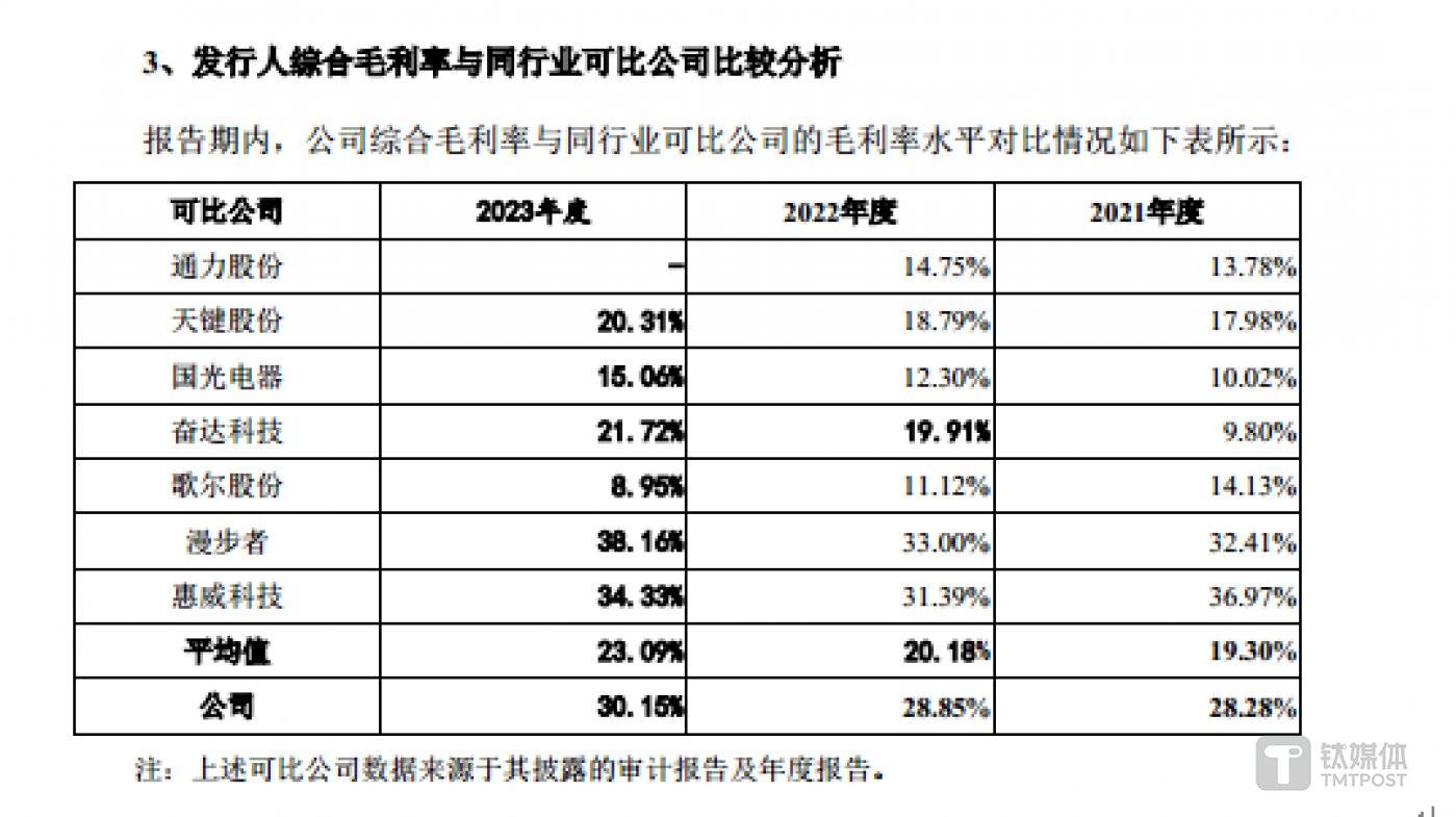 周天财经 APP 注意到,虽然汉桑科技的业绩在变脸,但产品的竞争力却越来越高。报告期内,汉桑科技的毛利率分别为 28.28%、28.85%、30.15%,同行业可比公司平均值分别为 19.3%、20.18%、23.09%,公司毛利率持续增长,且始终远超同行可比公司均值。