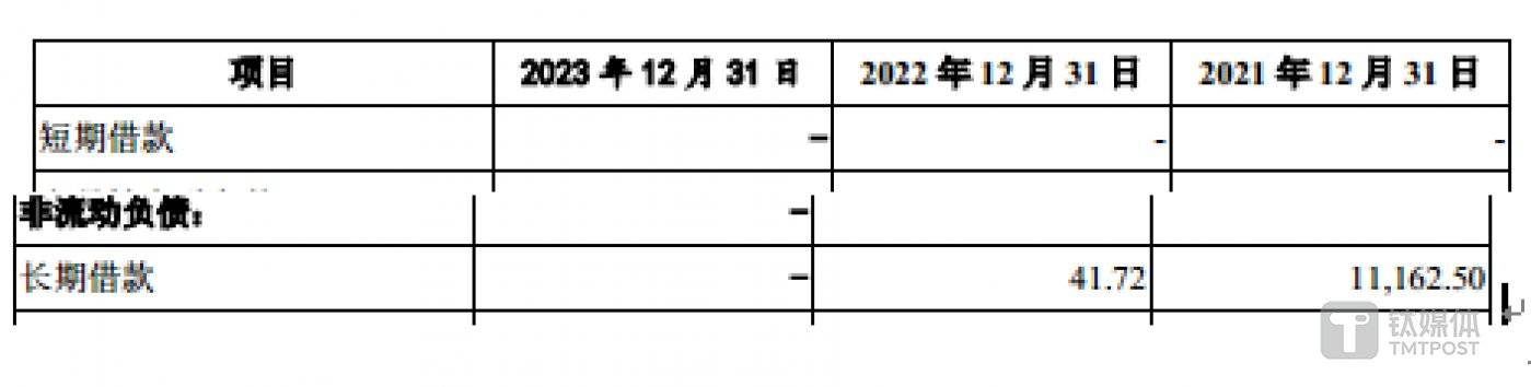 与此同时,在上述时间段内,汉桑科技的长期借款分别为 11162.5 万元、41.72 万元、0 万元,并且公司不存在短期借款,也就是说 2023 年,汉桑科技已无任何的短期借款和长期借款。