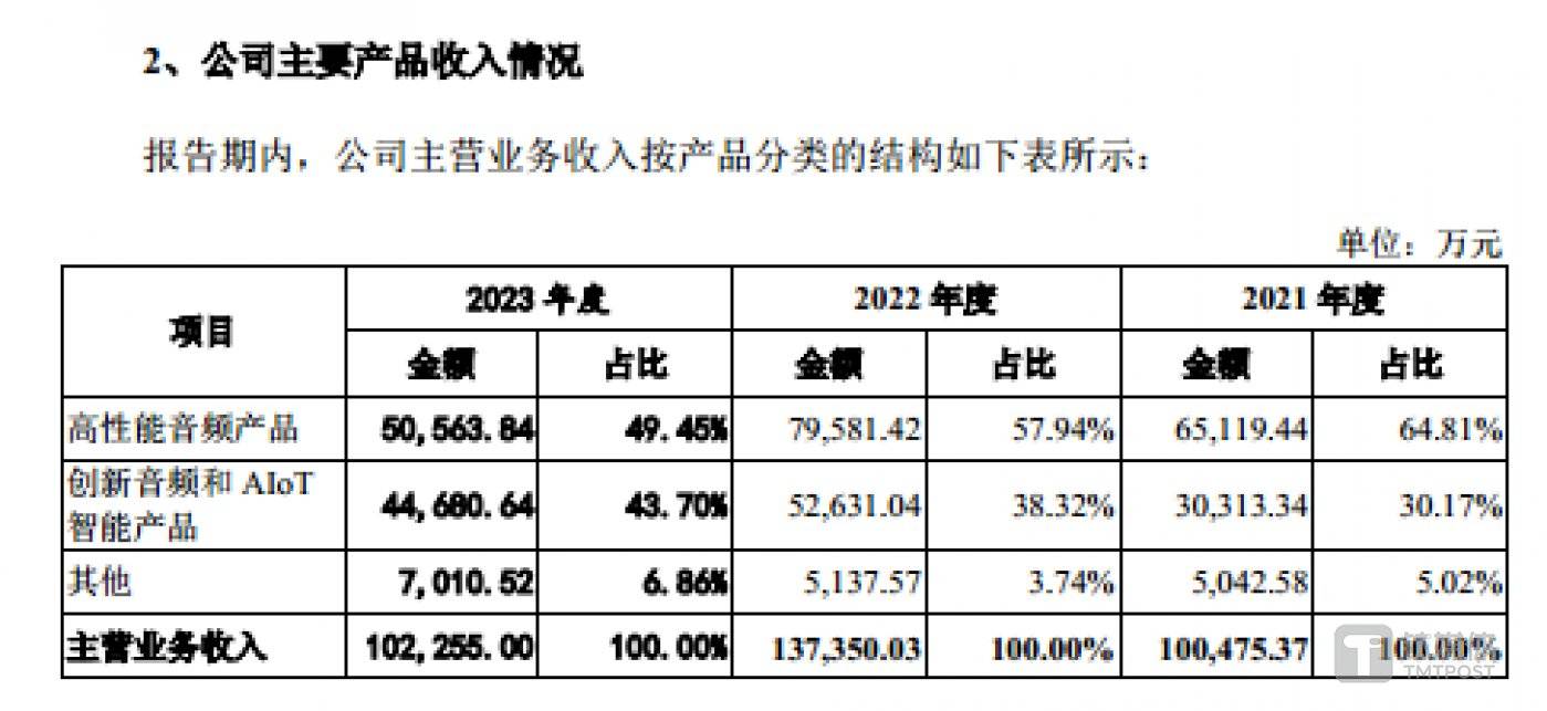 正是由于 2023 年高性能音频产品、创新音频和 AIoT 智能产品的收入均同比大幅下滑,才导致公司整体业绩下滑。