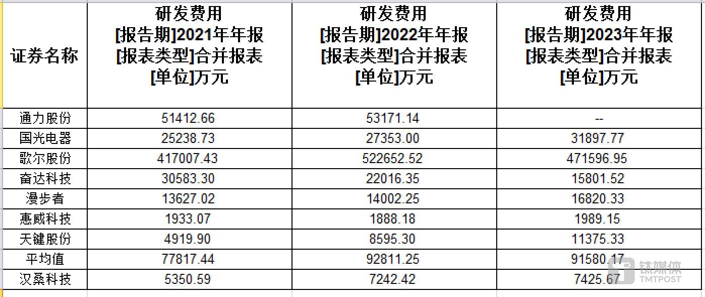 令人困惑的是,汉桑科技在招股说明书中披露其同行可比公司分别为通力股份、国光电器、歌尔股份、奋达科技、漫步者、惠威科技、天健股份,上述公司与汉桑科技的研发费用情况如下: