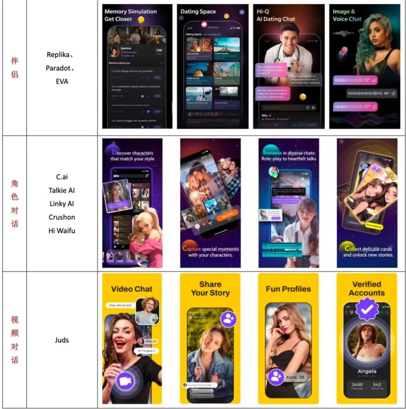 Replika、Paradot 和 EVA Character 虽然也支持用户与多个 AI 角色交互,但更加强调用户与其中一个或者少数 AI 角色进行更深度的互动,产生超出朋友之外的情感关联。