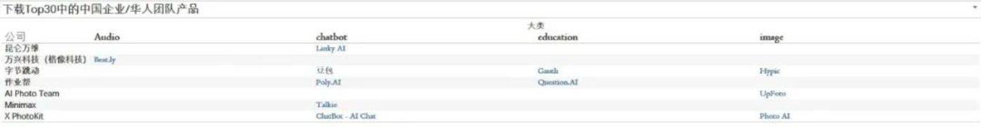 AI 出海,中国企业依然没有落下,前 8 个月下载 Top30 产品里有 11 款来自中国,美国和土耳其各自 5 款,剩余其他国家均只有 1 款产品入榜。