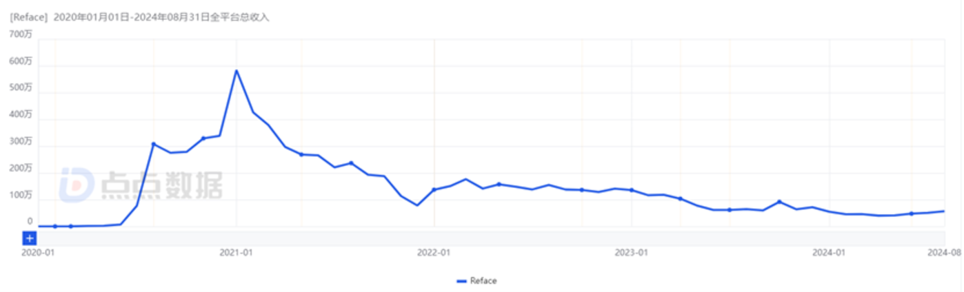 Reface 2020 年至今的月流水变化趋势,注:相比 2021 年的巅峰时期,Reface 的流水已经跌去了 80% 以上|图片来源:点点数据