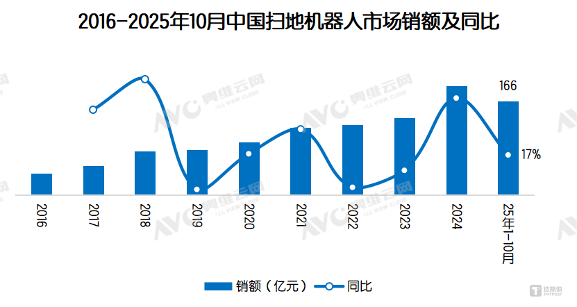 不同于电视、空调、冰箱,扫地机落地时间较短,仍处于规模化普及阶段。近两年,在技术迭代以及国补等政策性因素的推动下,扫地机迎来了快速增长,带动清洁电器的增速远超家电市场的大盘。奥维云网 (AVC) 监测数据显示,2025 年 1-10 月,扫地机器人行业累计销额达 166 亿元,同比增长 17%;零售量 528 万台,同比增长 18.5%,行业呈现量额齐升的亮眼态势。