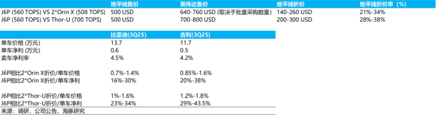 这有助于比亚迪和吉利这种规模大、低毛利的车企,采用地平线 J6P 芯片能加速城市 NOA 在平价车型上的渗透。