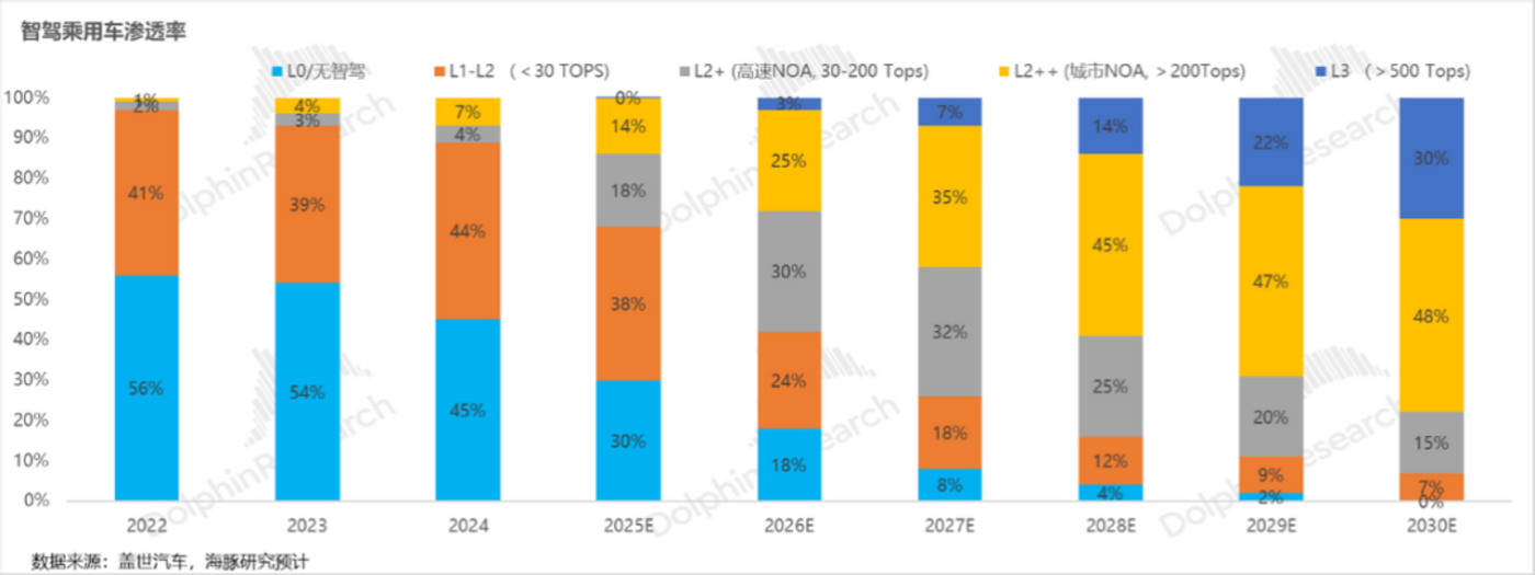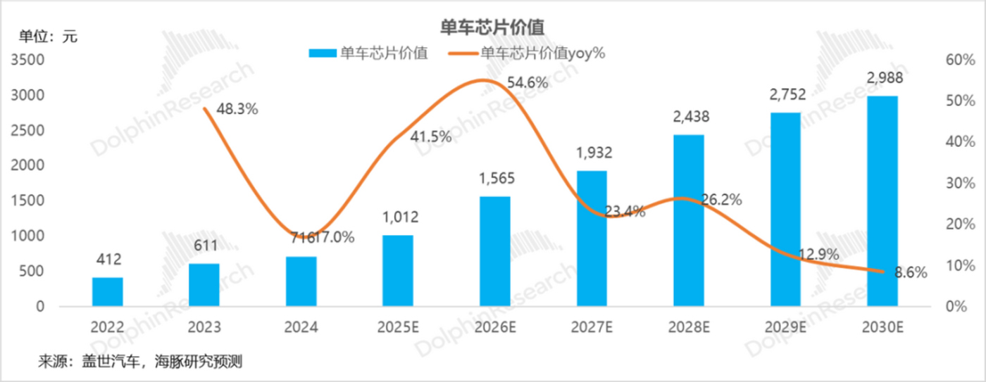 海豚君预计单车芯片价值将在 2030 年增长至近 3000 元,主要由大算力芯片占比的提升所带动 (200 TOPS 以上芯片占比达到 78%)。