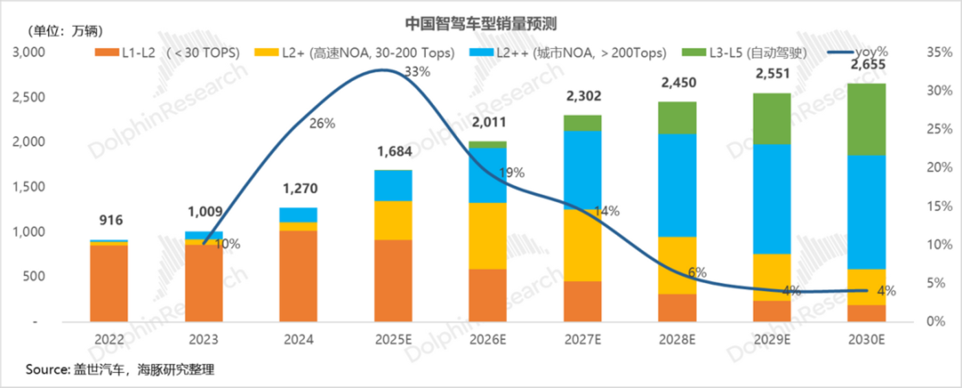 从销量维度来看:2024 年中国乘用车销量 2310 万辆,智驾渗透率 55%。海豚君预测到 2030 年,智能驾驶渗透率将达 100%,其中 L2+及以上渗透率达 93%(对应约 2655 万辆智驾车辆)。