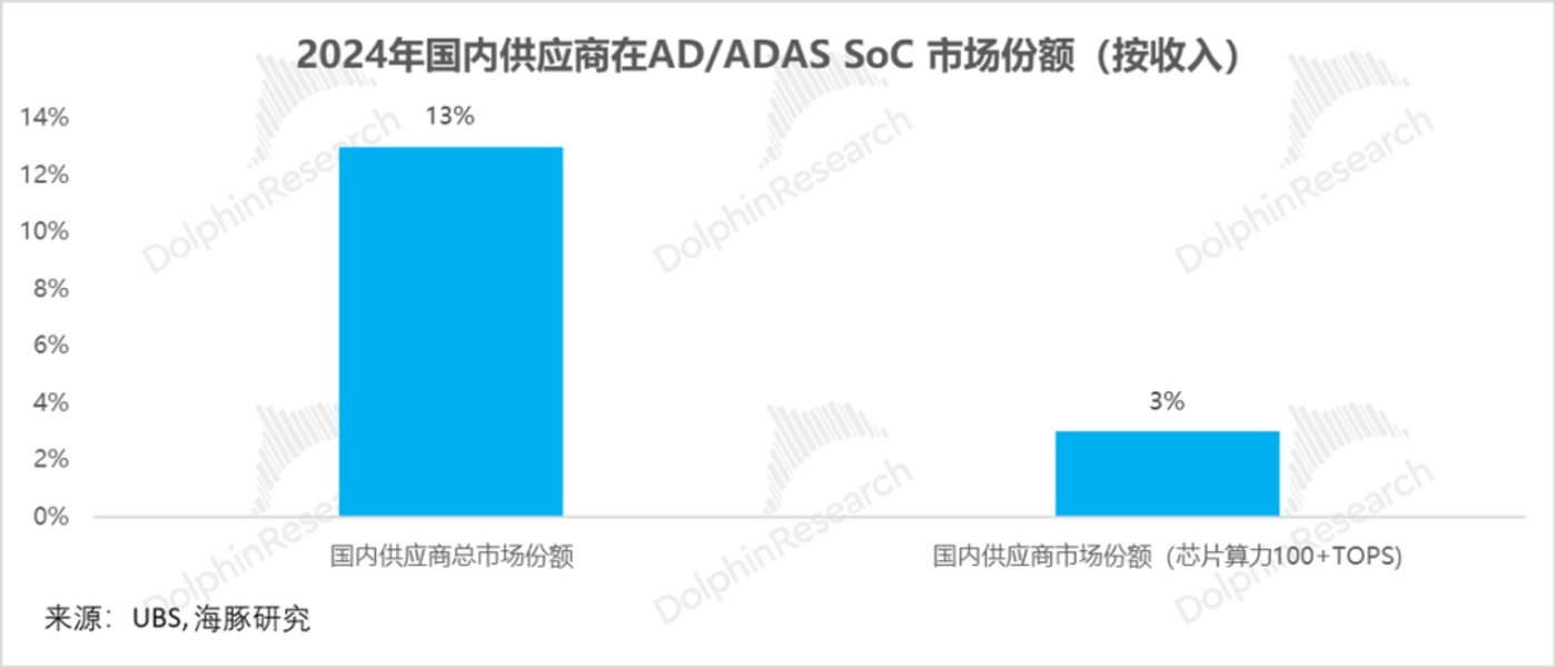2024 年,国内供应商的收入在中国车厂 AD/ADAS SoC 市场总规模中占比仅 13%,主要是高单价中高端芯片市场 (100+ TOPS) 是英伟达等主导,导致国内供应商的份额被挤压至仅 3%。因此,攻克并占领大算力市场,也已成为国产芯片实现替代、获取增长的关键路径。