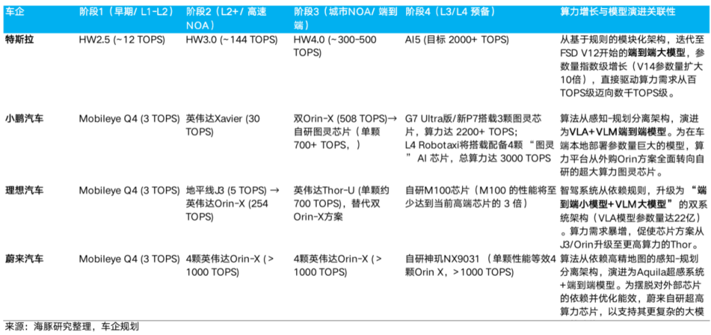 ④ 主机厂自研:特斯拉、小鹏汽车、蔚来汽车等。主机厂追求软硬一体化深度整合,掌握供应链自主权以及降低 BOM 成本,同时可将智驾芯片扩展至具身智能上。但自研芯片门槛高,对车企的销量规模,人才储备和资金投入要求都很苛刻,不是谁都能做。