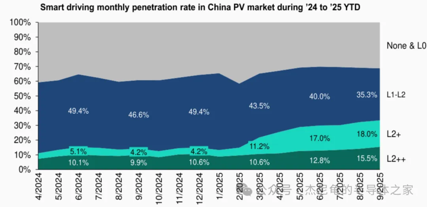 但 2025 年,在以比亚迪为首的 「智驾平权」 将高速 NOA 下沉到 10-20 万元级别的平价车型中;以华为和新势力为首的 「智驾引领」 梯队则加速普及高阶的城市 NOA,L2+及以上 9 月达到了 33.5%,智驾渗透率正在加速提升。