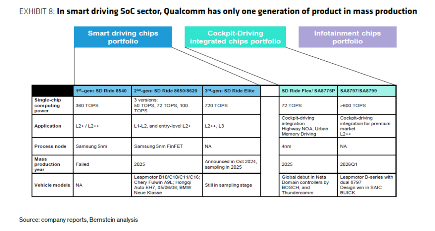 高通下一代智驾芯片侧重 「舱驾一体」,把驾驶和座舱集成到一颗 SoC 中 (如规划中的 SA8797/SA8799 等),将于 2026 年一季度量产。目前的定点车型为零跑 D 系列 (搭载双 8797 芯片),未来大芯片市场可能有机会。