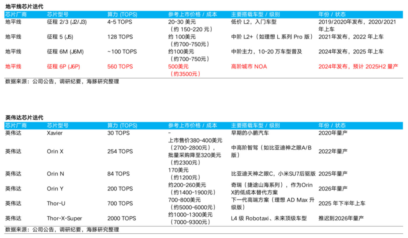 地平线作为国产智驾芯片核心玩家,24 年国内出货量市占率有三四成,25 年开推高阶芯片 J6P,搭配城市 NOA 算法 HSD,向英伟达发起冲击。