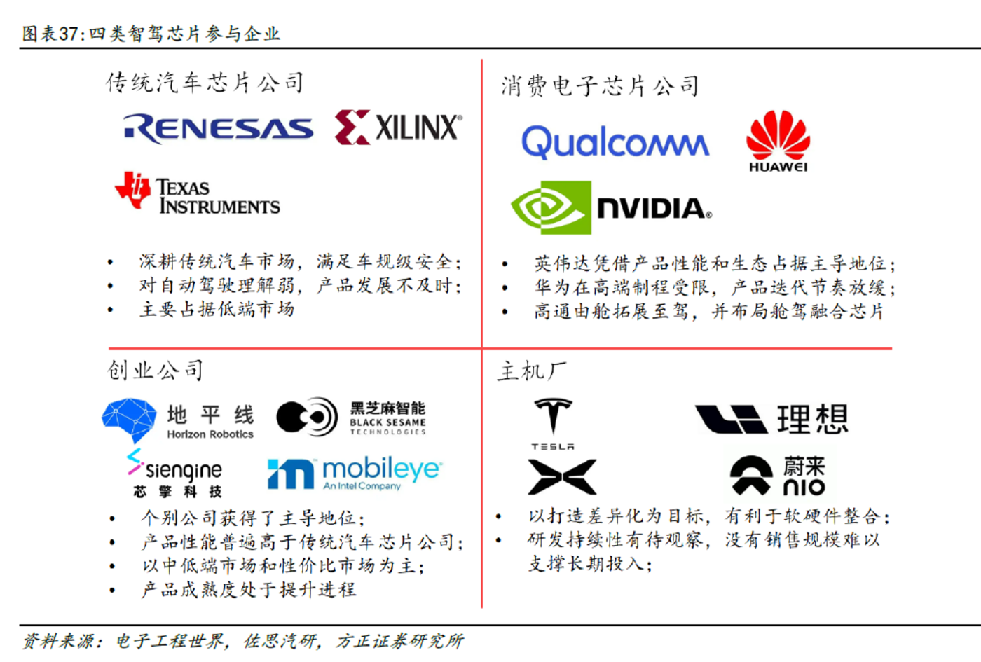 ① 垂直一体化玩家:特斯拉和华为。特斯拉采用自研自用的垂直整合模式,很早就自研芯片,华为也为 「智选车」+「HI 模式」 下的车企提供软硬一体化的智驾方案。