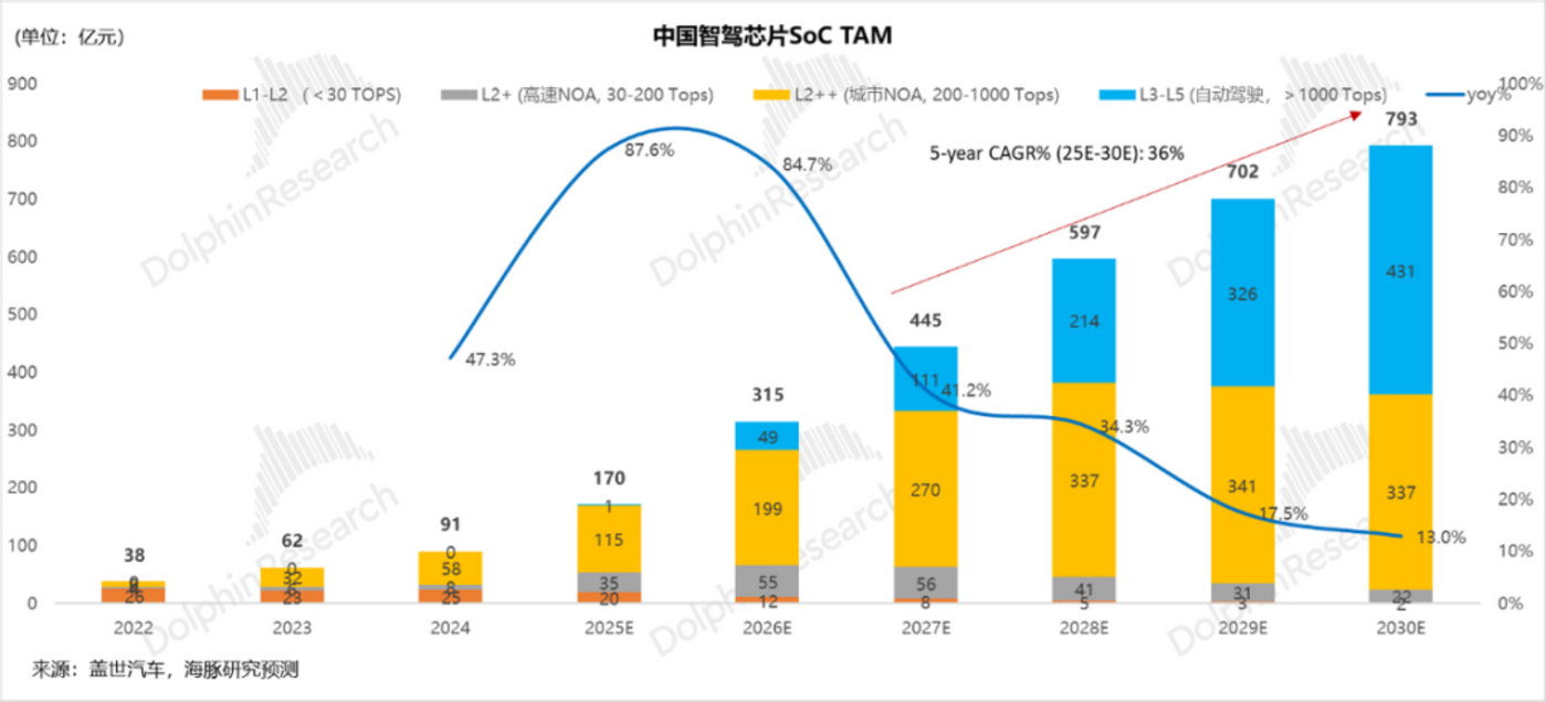 正是因为智驾芯片的 「量价齐升」 逻辑,海豚君测算 2025—2030 年市场规模 CAGR 将达到 36%,至 793 亿元。其中单车芯片价值 5 年 CAGR 为 24%, 智驾车型销量 5 年 CAGR 为 10%。