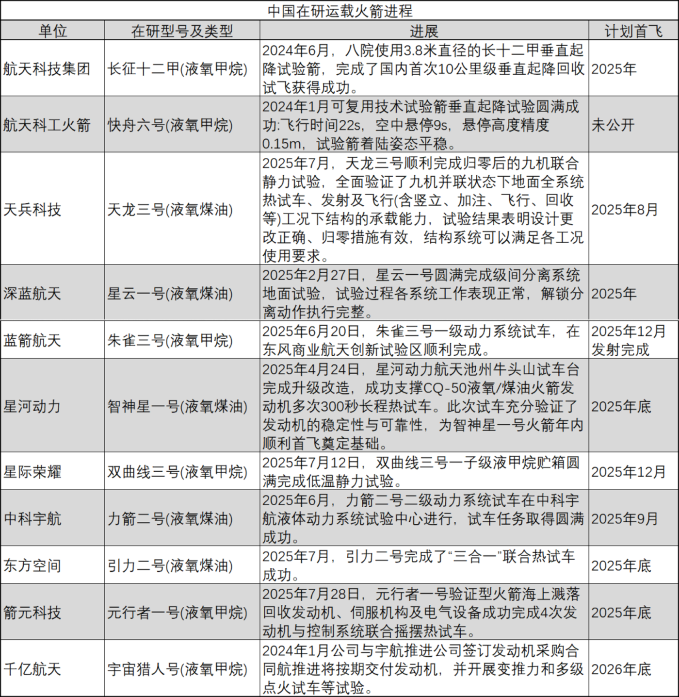 我国可回收火箭,除 12 月初回收失败的 「朱雀三号」 外,还有航天系旗下的长征十二甲、快舟六号等国家队箭型,天龙三号、引力二号、双曲线三号、智神星一号等民企研制的可回收箭型,大部分箭型计划于 2025 年底首飞。