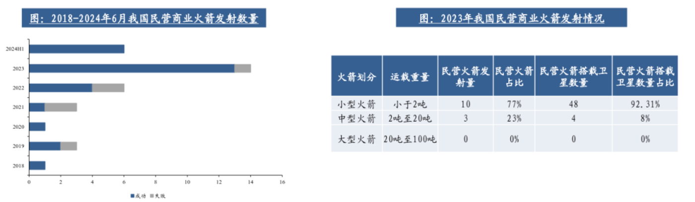 商业航天 2.0 时代,民营企业商业航天力量不容小觑,公开资料显示,从 2018 到 2024 年 6 月,民营企业累计发射火箭 34 次,其中 27 次发射成功,7 次发射失败。从总体趋势来看,民营火箭发射数量不断上升,经历了 2018 到 2021 年的探索期,发射成功率逐步提升,2022 年开始民营火箭发射数量逐步增长,2023 年发射 14 次,与 2018-2022 年发射总和持平。