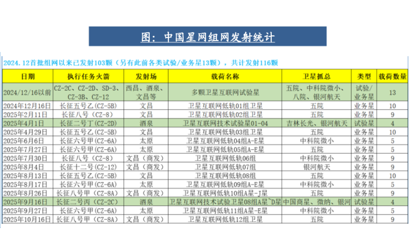 根据 ITU(国际电信联盟) 规定,申报 7 年内发射首颗卫星,9 年内发射星座总数量的 10%,12 年内完成 50%,14 年内必须 100% 部署完毕。以中国星网规划的 12992 颗卫星 (2020 年 9 月申请) 为例:2027 年至少发射一颗卫星 (已完成),2029 年需在轨约 1300 颗 (10%)2032 年累计 6500 颗 (50%)2034 年:完成全部 1.3 万颗部署。截至 2025 年 10 月,星网共发射 116 颗卫星 (含实验星和业务星)。