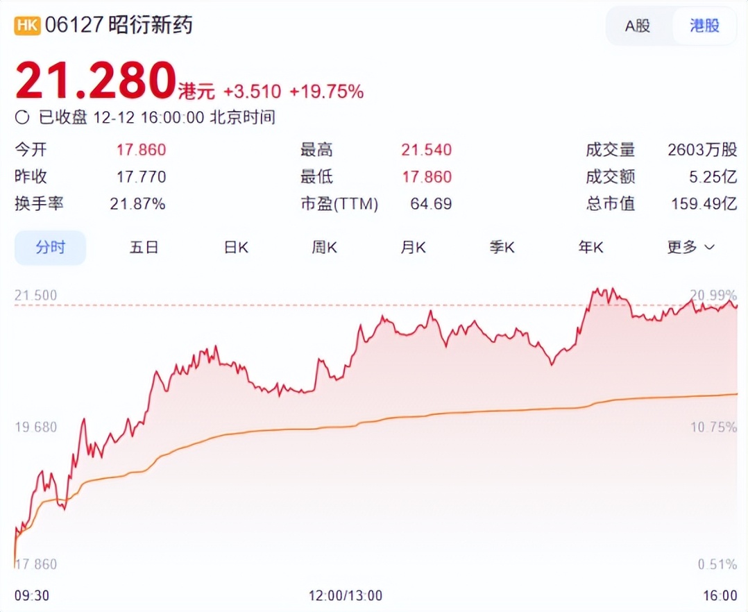 12 月 12 日,昭衍新药 (06127)H 股早盘涨逾 11%,截至收盘股价涨幅达 19.75%,报 21.28 港元/股。