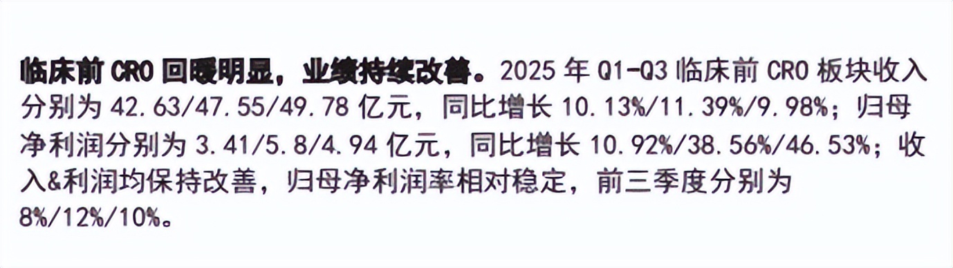 好消息是,进入 2025 年,基于政策利好、投融资回暖、药企研发需求增长、创新技术驱动等,CRO 产业复苏信号越来越明显。方正证券研报显示,2025 年前三个季度,临床前 CRO 板块收入分别为 42.63 亿元、47.55 亿元、49.78 亿元,同比增长 10.13%、11.39%、9.98%,归母净利润分别为 3.41 亿元、5.8 亿元、4.94 亿元,同比增长 10.92%、38.56%、46.53%。
