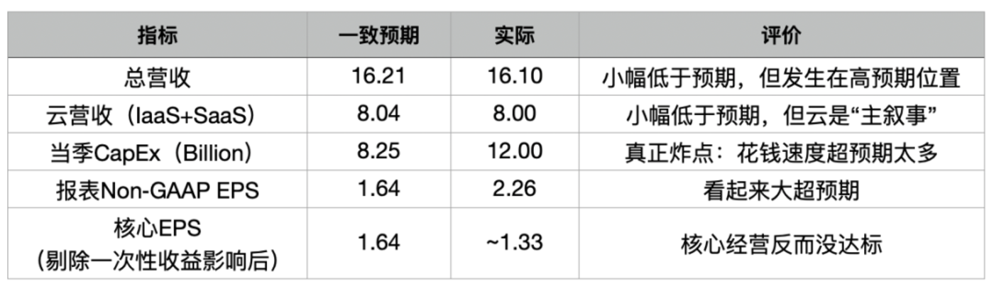 EPS 指标没问题,利润主要被一次性收益 「美化」,营收、云收入只是轻微偏差;真正拉开差距的是 CapEx(12Bvs8.25B) 和核心盈利质量。而这两项,恰恰是 「重资产转型期」 市场最敏感的地方。