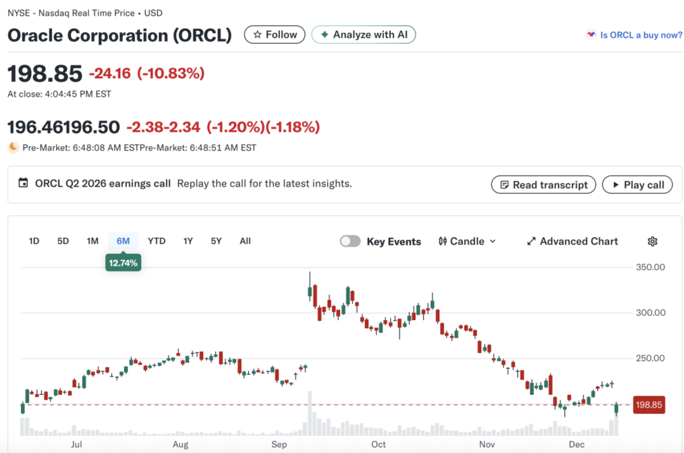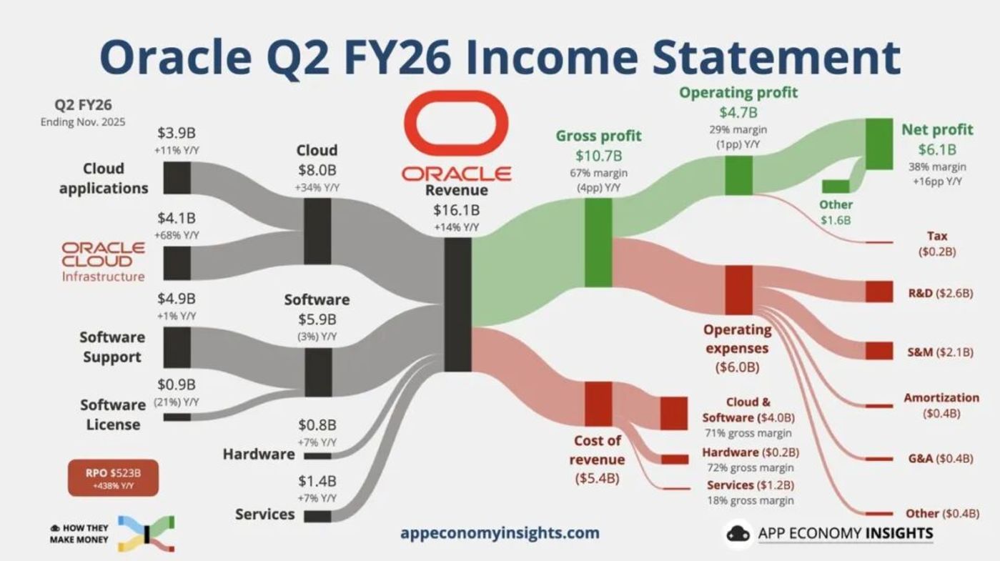 12 月 10 日盘后,甲骨文 (ORCL) 交出 FY2026Q2(截至 11 月 30 日) 的成绩单,第二天股价直接砸出一根大阴线。很多人第一反应是:云还在增长、EPS 还挺好看,怎么就崩了?
